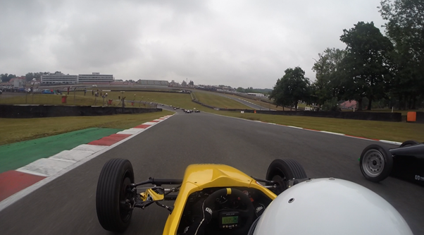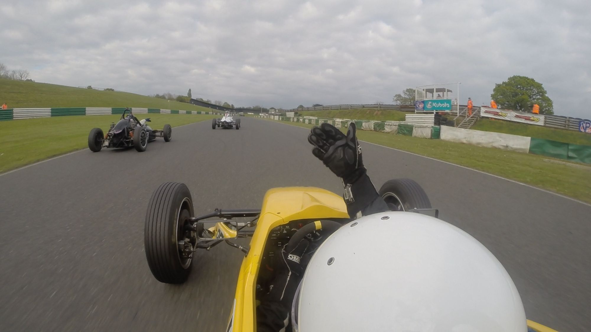 Now…there is no easy way to communicate to other drivers other than with your hands. Both myself and Ross were frantically gesturing for Rik to give the places back. The green flag was shown on entry to the hairpin, and we were back racing again.