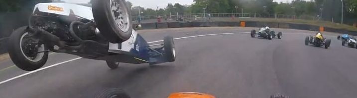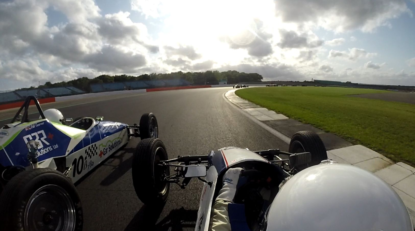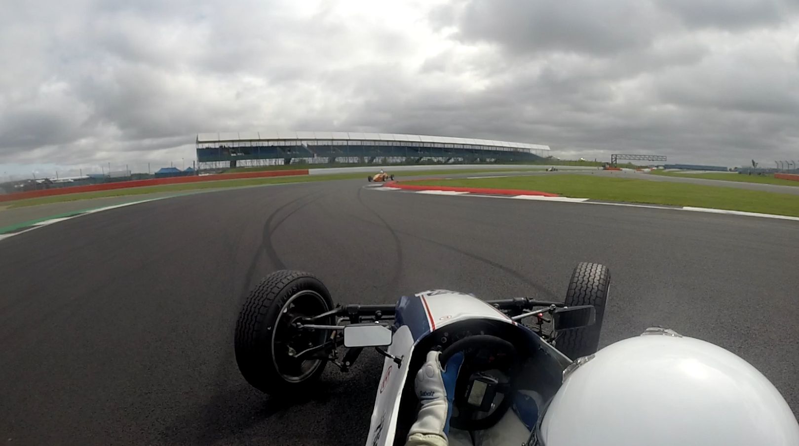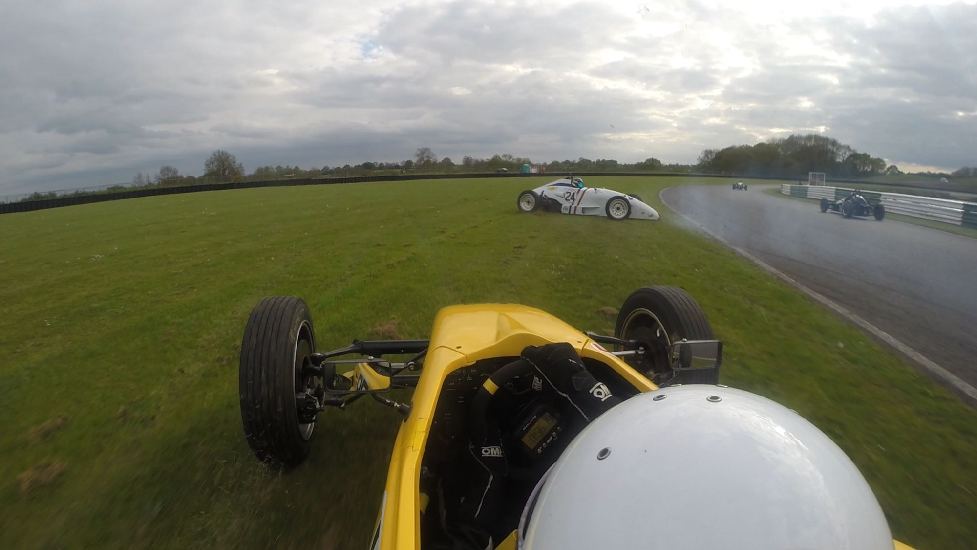 A good exit and I was able to draft past Neil Aldridge before the Esses. Heading for Gerards trip #2, I saw the orange Storm of Sam Engineer take a wide line through the corner and start to pirouette as he touched the grass. Now, making a bit of a school boy error I was too focussed on the orange Storm up ahead instead of the racing line. I ended up joining Sam in a tandem Storm pirouette…Doh..